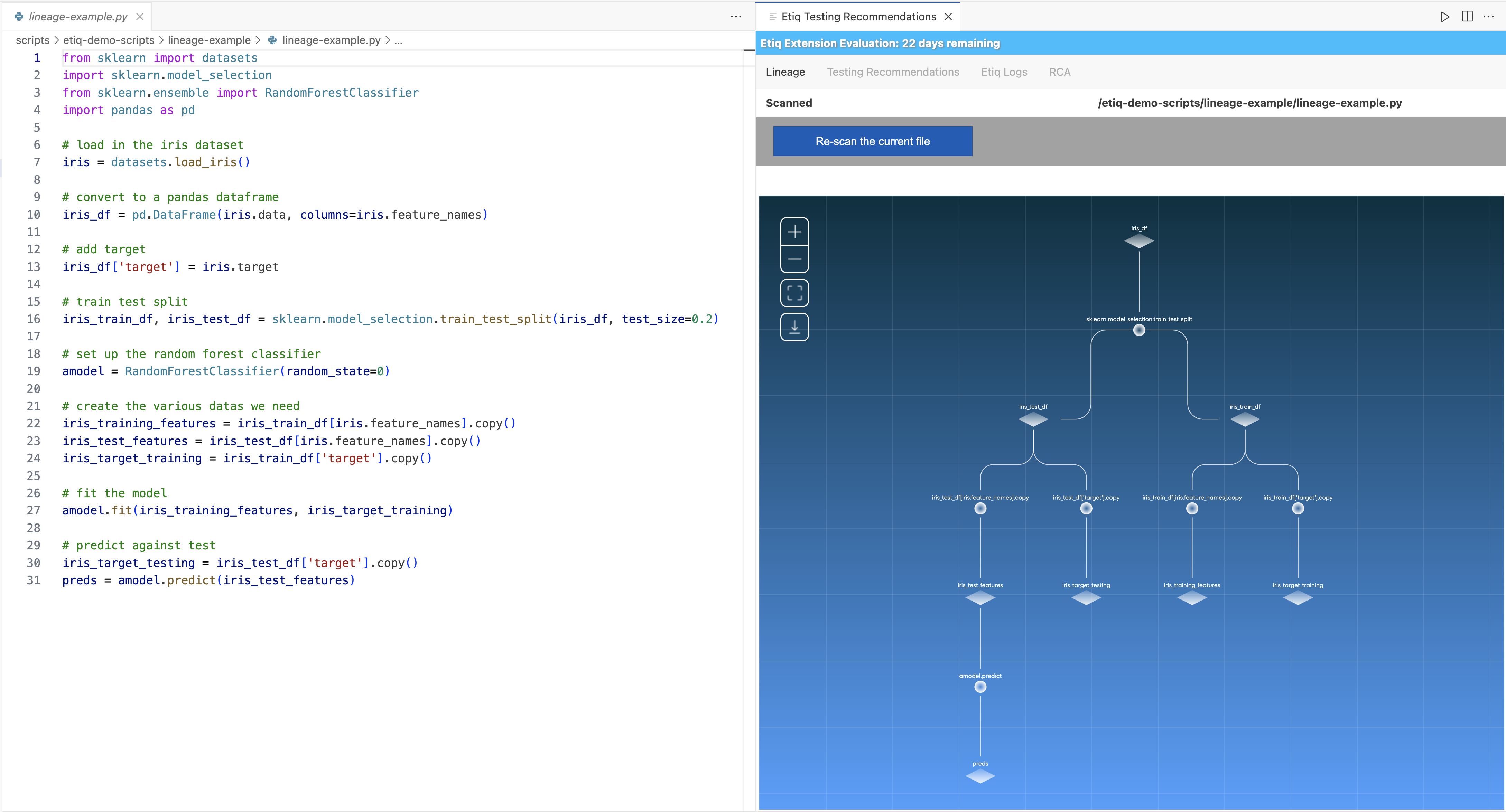With your script open on the left, click Scan the current file in the Etiq extension on the right. This will then scan your code and data and show you your Lineage in the Lineage pane.